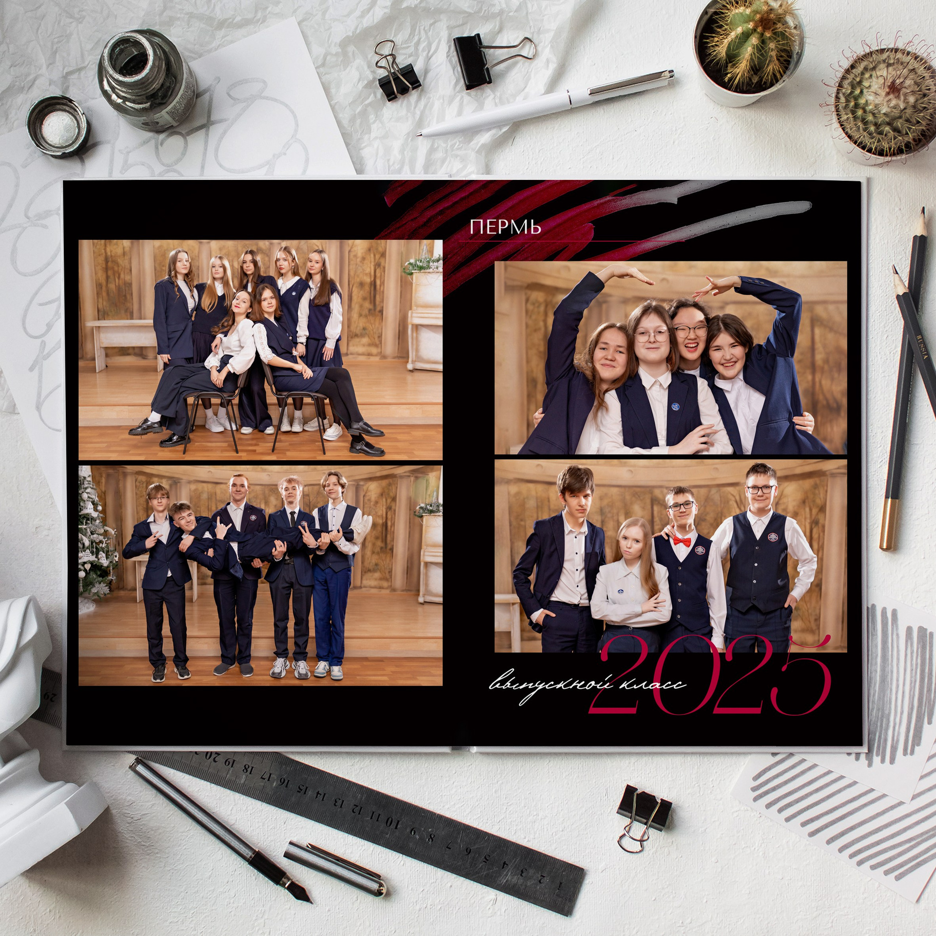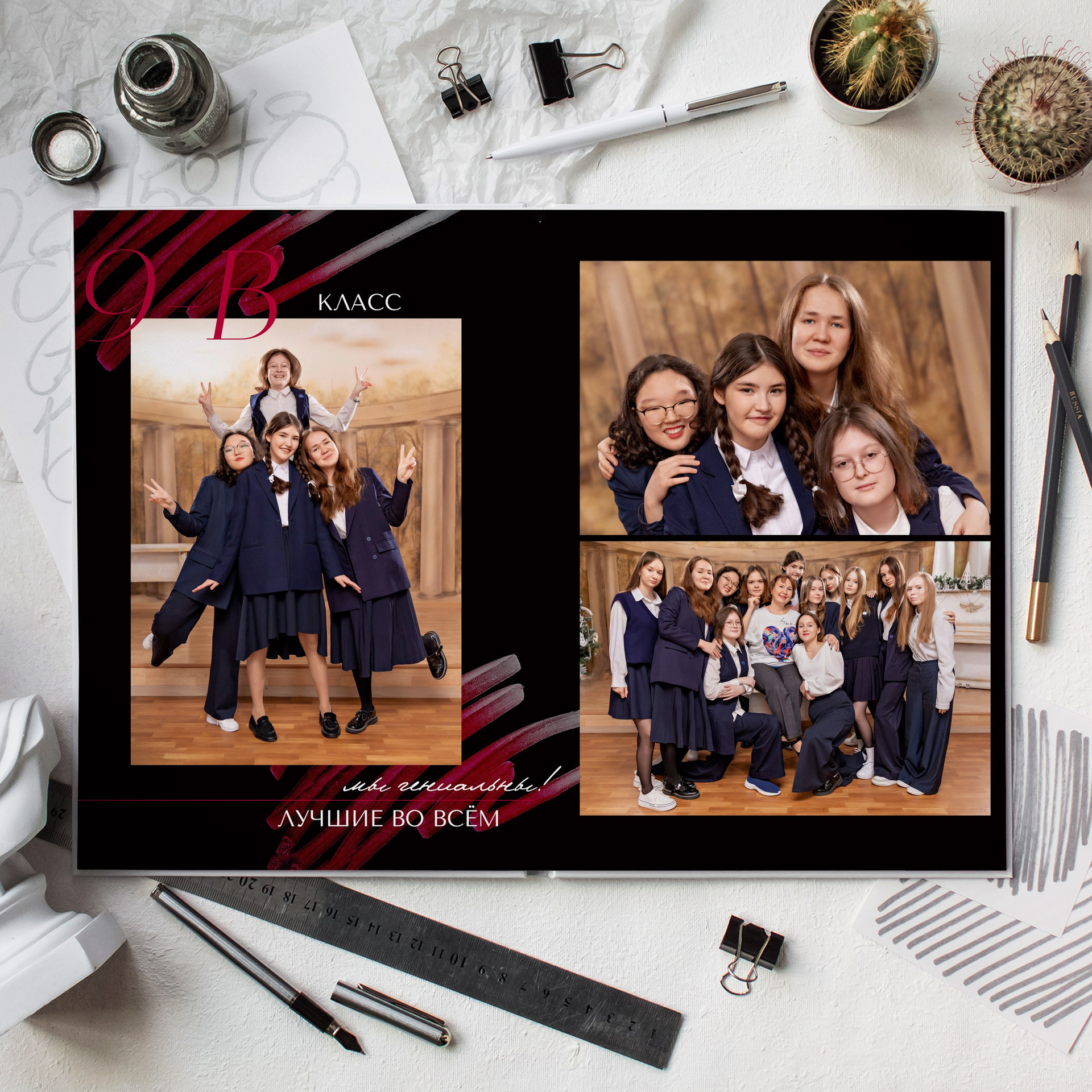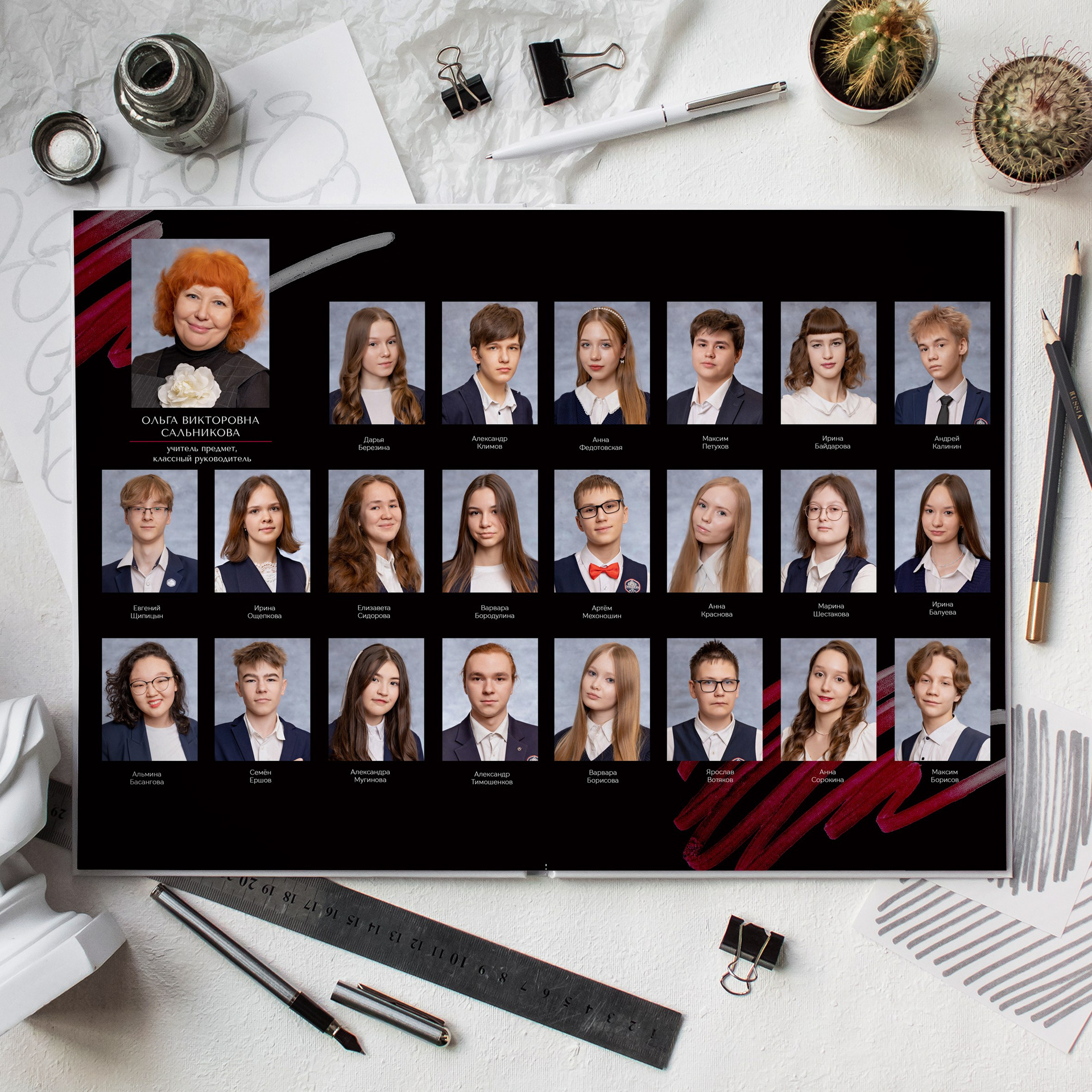На 5 разворотов: обложка с портретом ребенка, разворот с портретом учителя и словами от учителя ученикам, портреты учителей, которые придут на съемку, 2 индивидуальных портрета на развороте, 3 фото с друзьями, групповые фото с одноклассниками (разворот одинаковый у всего класса!), виньетка, +общее фото одним кадром (если на съемке были все дети, отсутсвующих НЕ «прифотошопливаю») ЛИБО сочинение о школе на обратной стороне обложки, + «оживайка» —видеоклип длительностью до 1,5 мин. — 3300 руб.